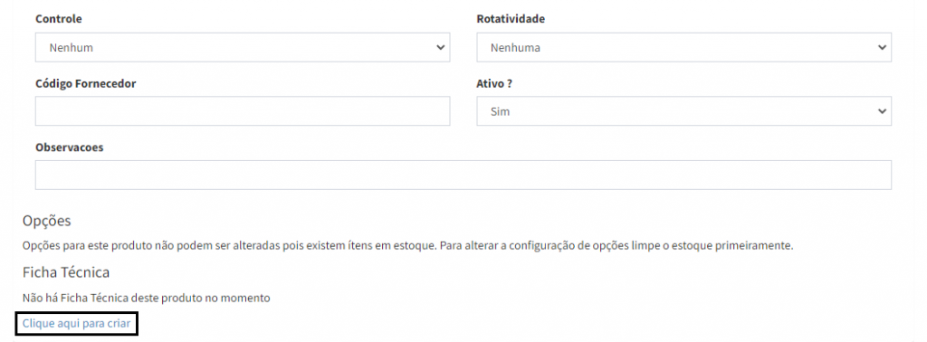7. Em seguida o sistema ira abrir a tela para criar a ficha técnica com a matéria prima que compõe a fabricação do item.