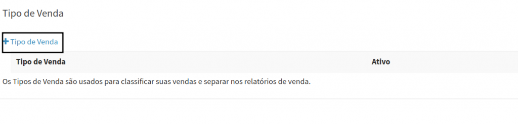 3. Na tela Tipo de Venda, clique em tipo de venda para cadastrar os tipos de vendas.
