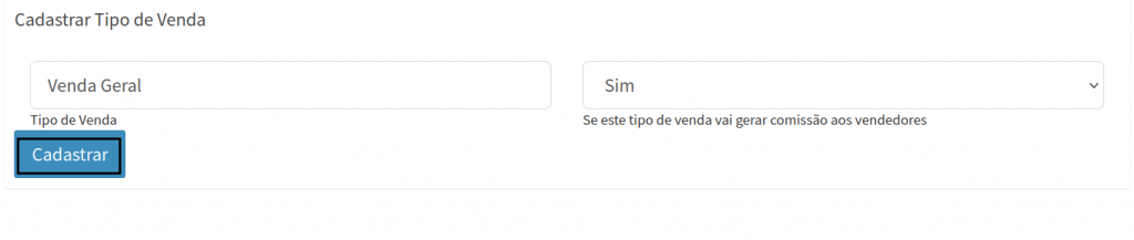 4. Em Cadastrar Tipo de Venda informe as seguintes informações: