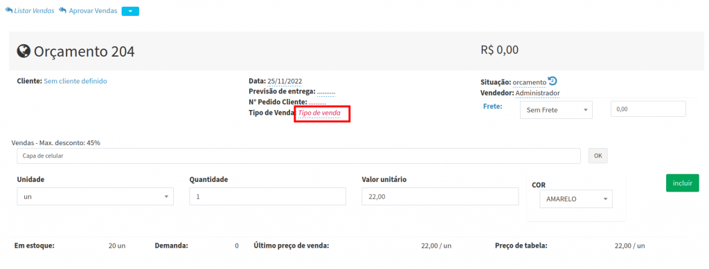 Após realizar o cadastro do tipo de venda, ao fazer uma venda o sistema exibi a opção de selecionar o tipo de venda desejada.