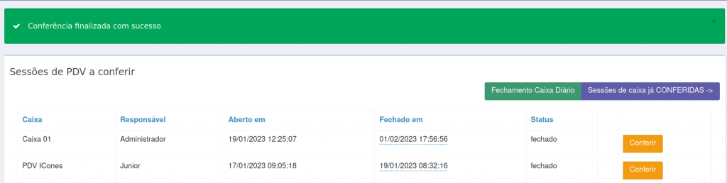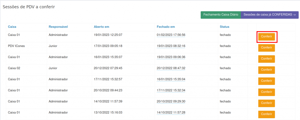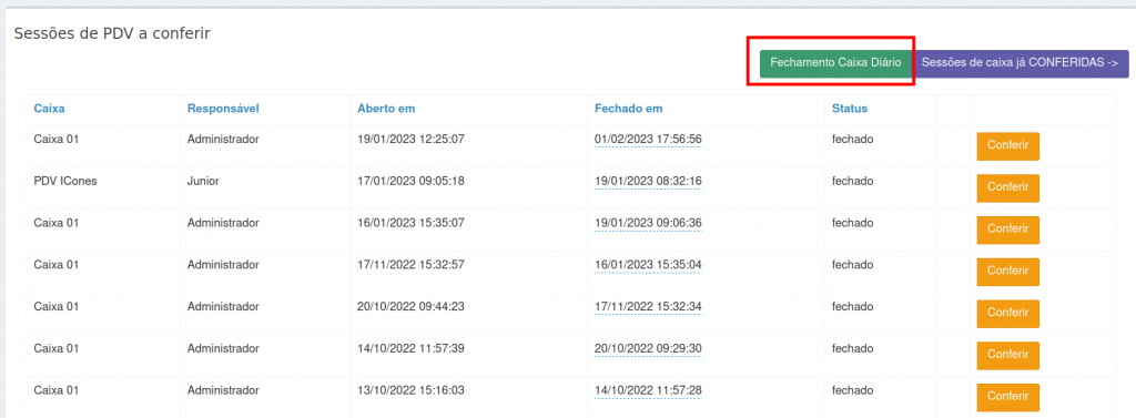 8. Na tela Sessões de PDV a conferir, você também tem a opção de realizar o Fechamento do Caixa Diário.