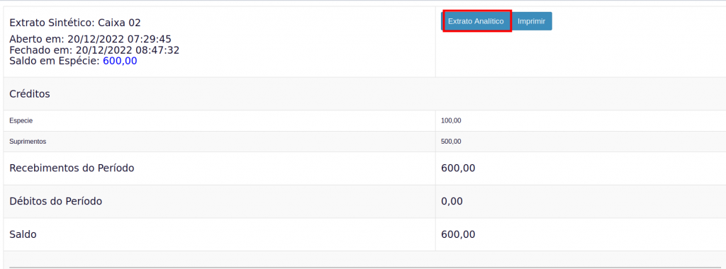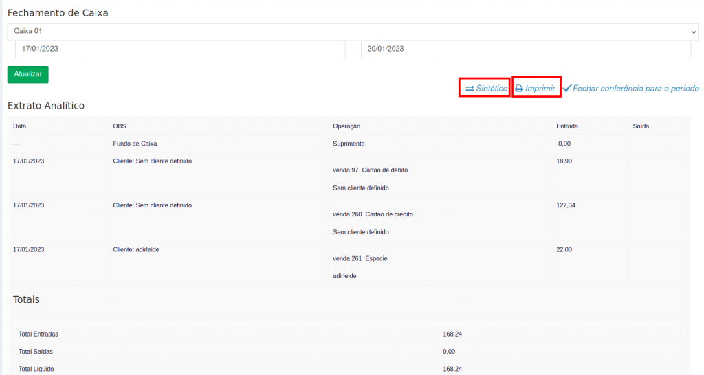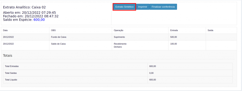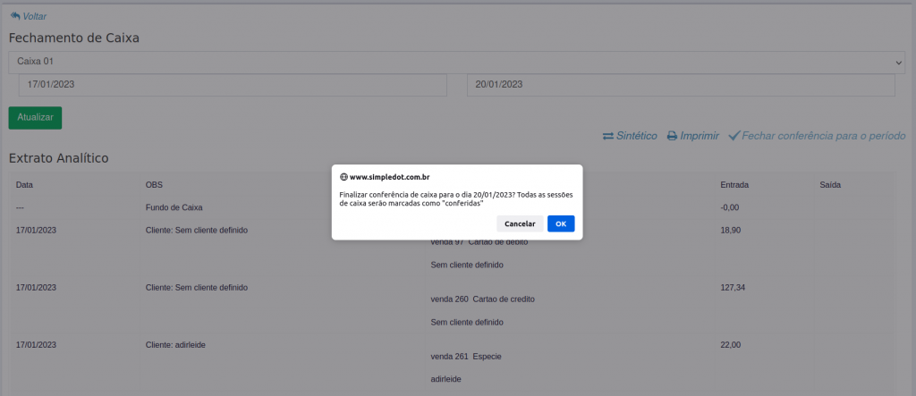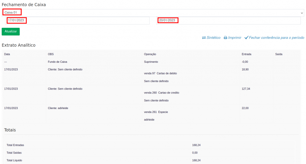 4. Você será direcionado para tela de realizar a conferência do fechamento de caixa, onde você pode escolher o extrato analítico ou sintético.