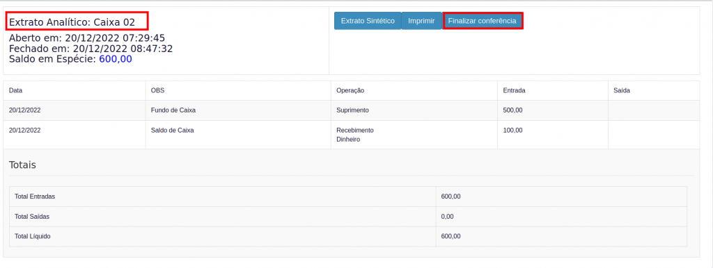 5. após realizar a conferência do fechamento de caixa, no Extrato Analítico vá na opção Finalizar conferência para realizar o fechamento da conferência do caixa.