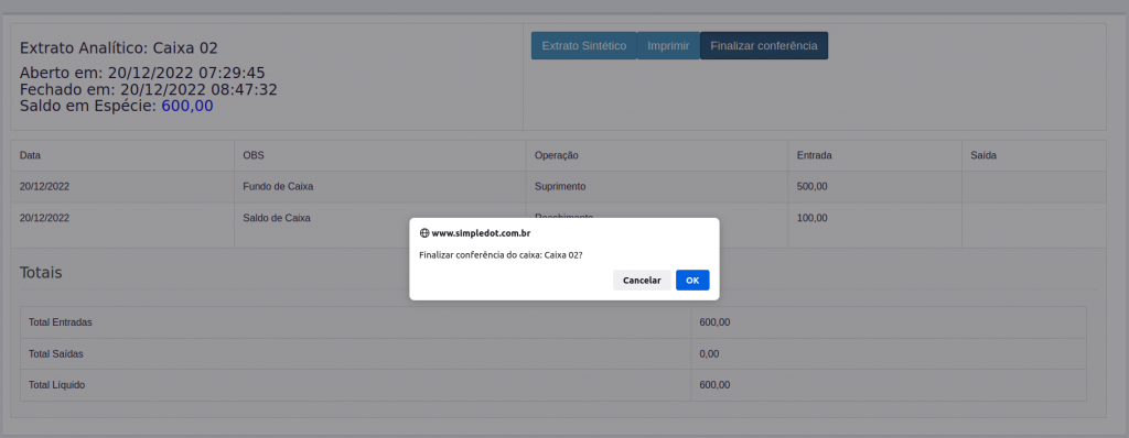 6. O sistema exibe uma caixa de dialogo, perguntando se deseja ( finalizar conferência do caixa)