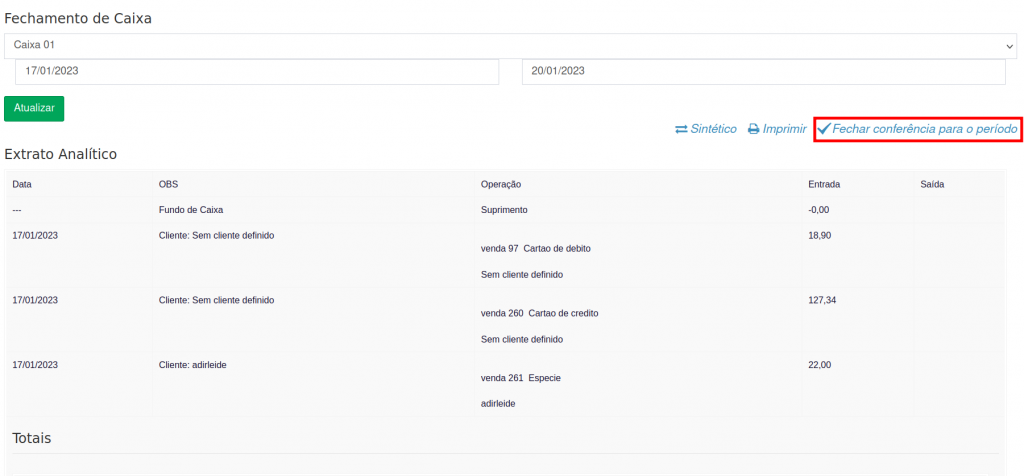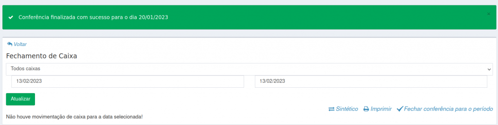 9. Após realizar a conferência, clique em Fechar conferência para o período, para finalizar a conferência do fechamento de caixa.