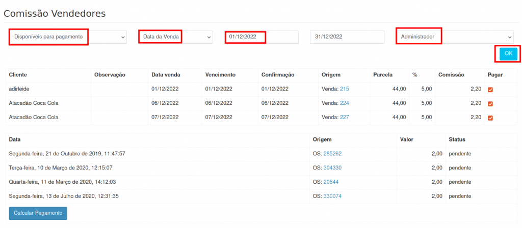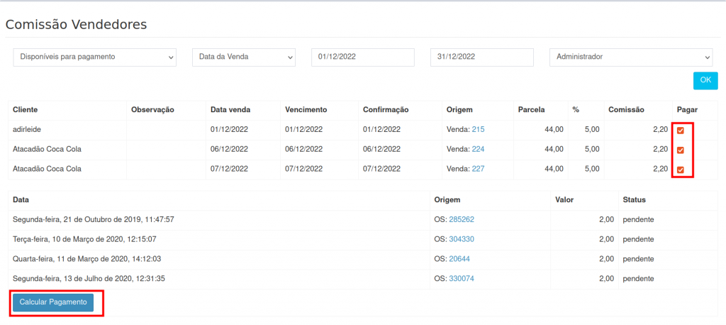 4. Em seguida o sistema exibe as comissões que estão disponível para pagamento, selecione as comissões que deseja pagar, depois clique em Calcular pagamento.