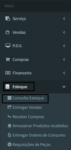- No menu principal, localizado no canto esquerdo, acesse o módulo Estoque e clique na opção Consultar Estoque.