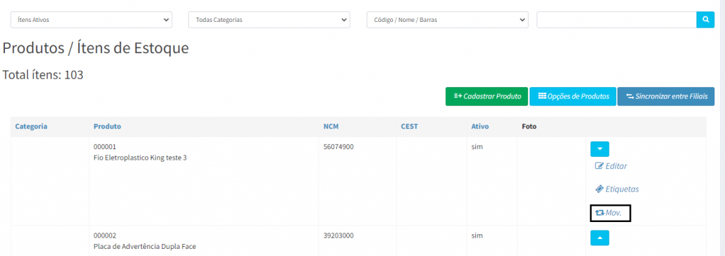 4. Após localizar o produto, clique no botão azul no canto direito da coluna e selecione a opção Movimentações.