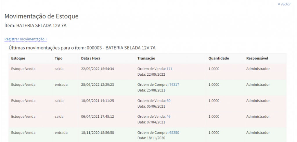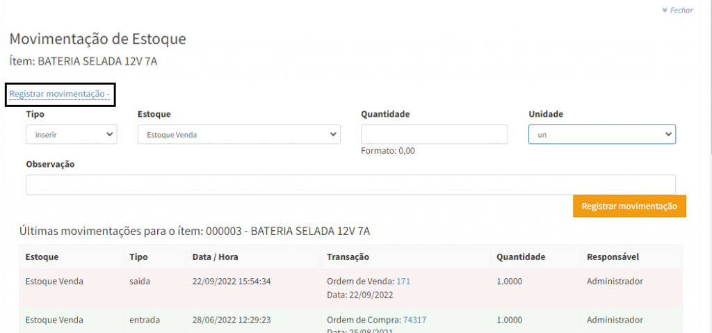 5. A tela vai redirecionar para o histórico de movimentações do produto no estoque.