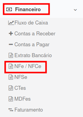 - Acesse no menu principal, localizado no canto esquerdo do sistema, o campo Nota Fiscais, seguido por NFe/NFCe