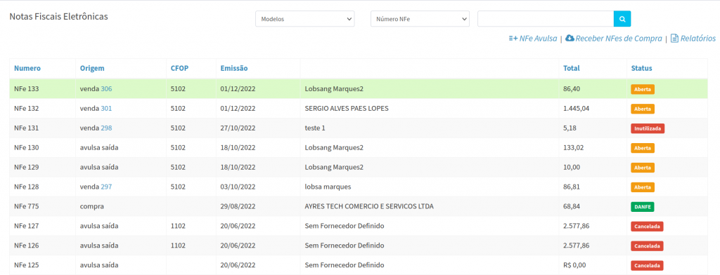2. Na tela Listar NF-e, localize a nota fiscal que deseje emitir a carta de correção: