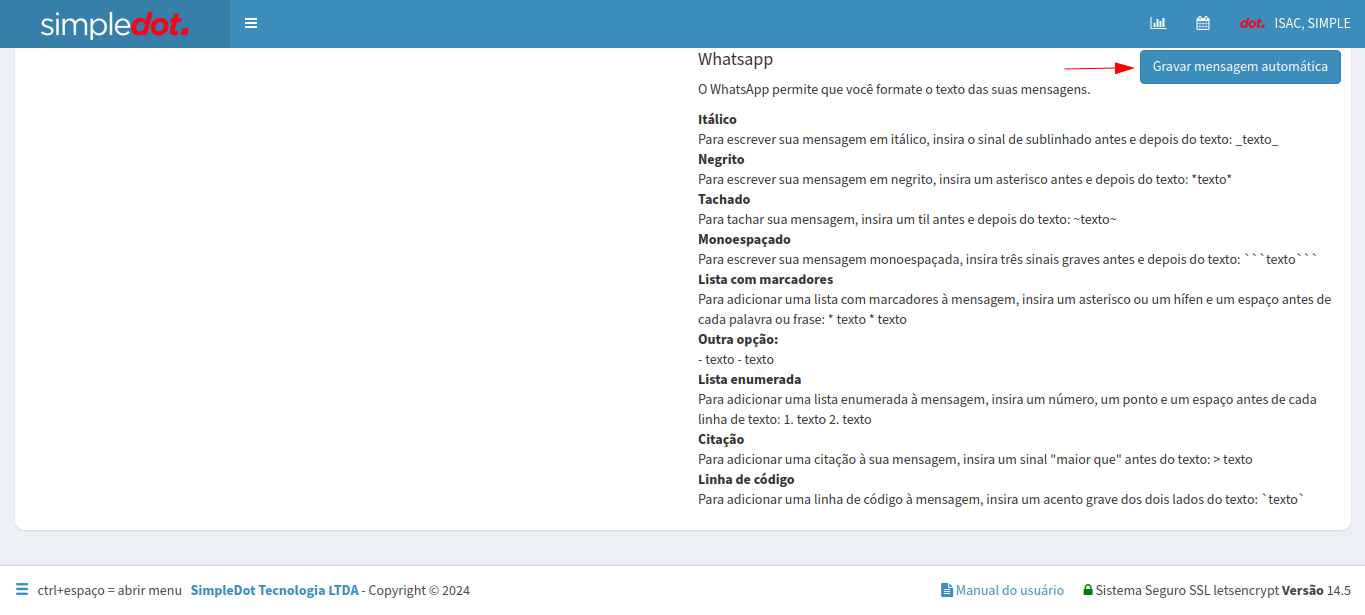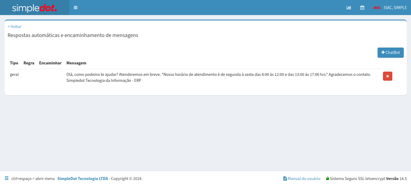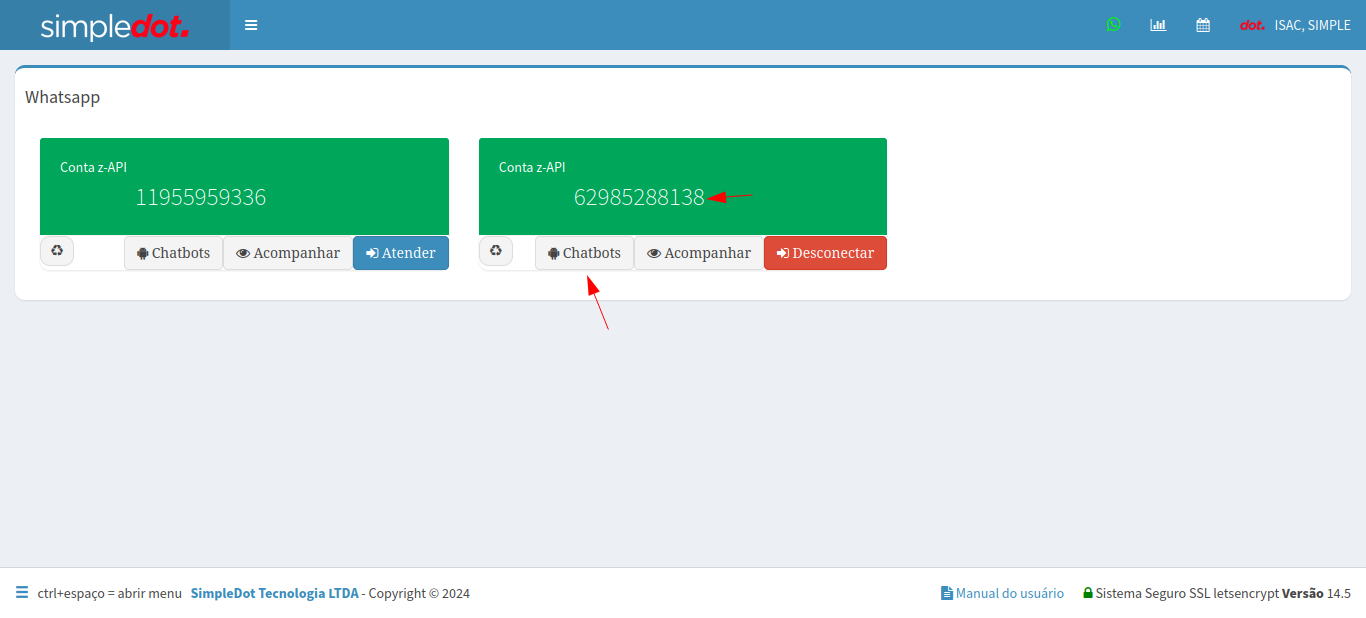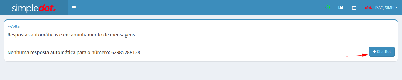 Já feita o cadastro e configuração vai aparecer as informações de Chat bot/Acompanhar ou Atender, no caso vamos criar os scripts de Bot de mensagens automáticas.