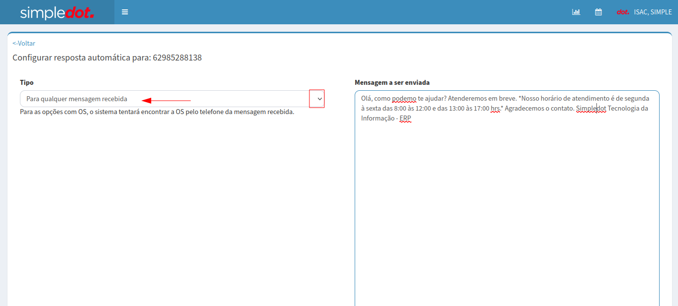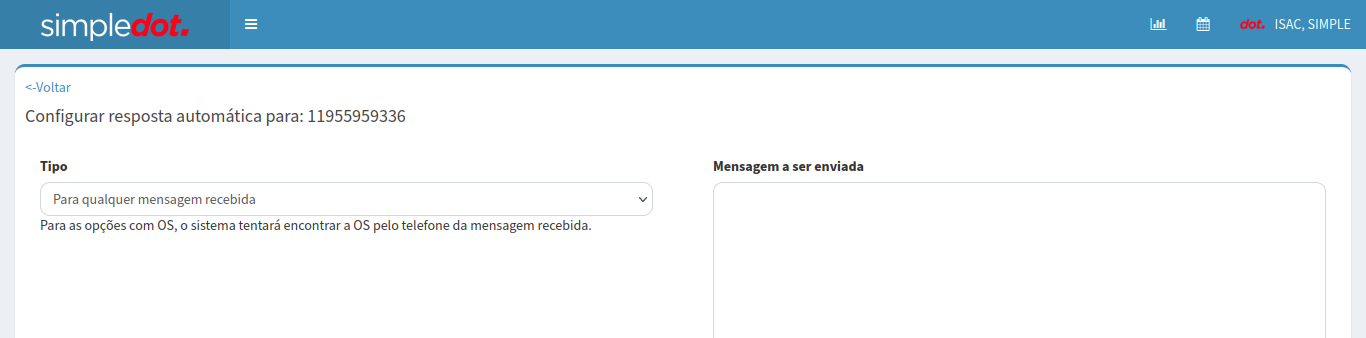 Escolhendo o tipo Exemplo: (Para qualquer mensagem recebida) e a mensagem a ser enviada ex: o script.