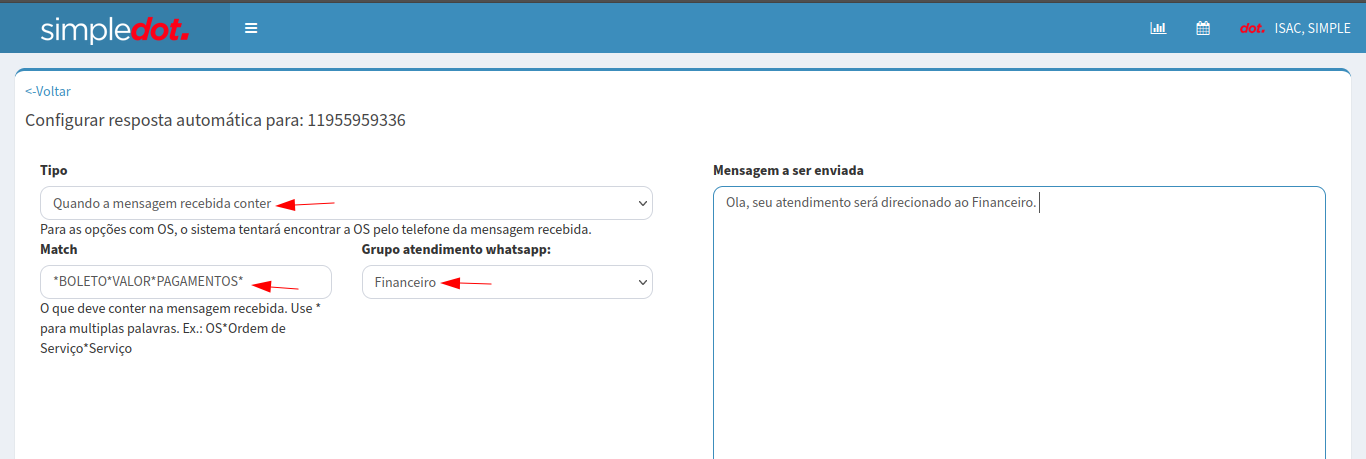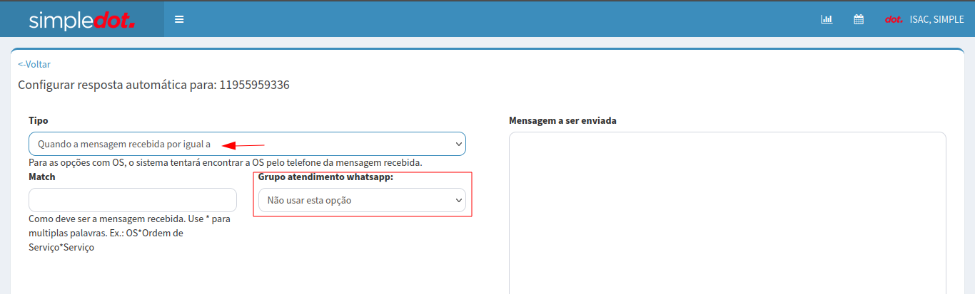 Seguindo a opções de tipos de mensagens podendo ser (Quando a mensagem recebida por igual a ….)seria as escolhas pelo campo de baixo (Match) e abre a opção de Grupo de atendimento