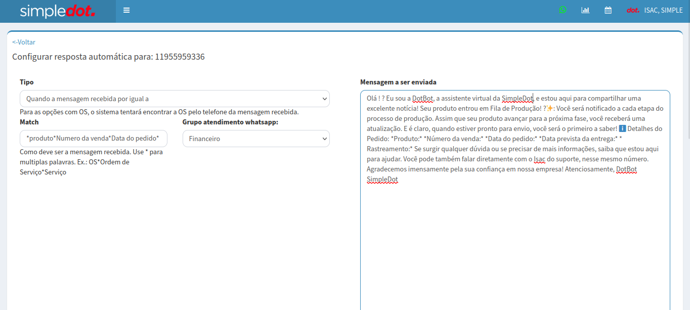 Colocando as Tipo de quando a mensagem recebida conter as múltiplas palavras chaves no Match e a mensagem a ser enviada.