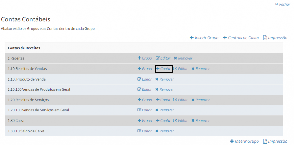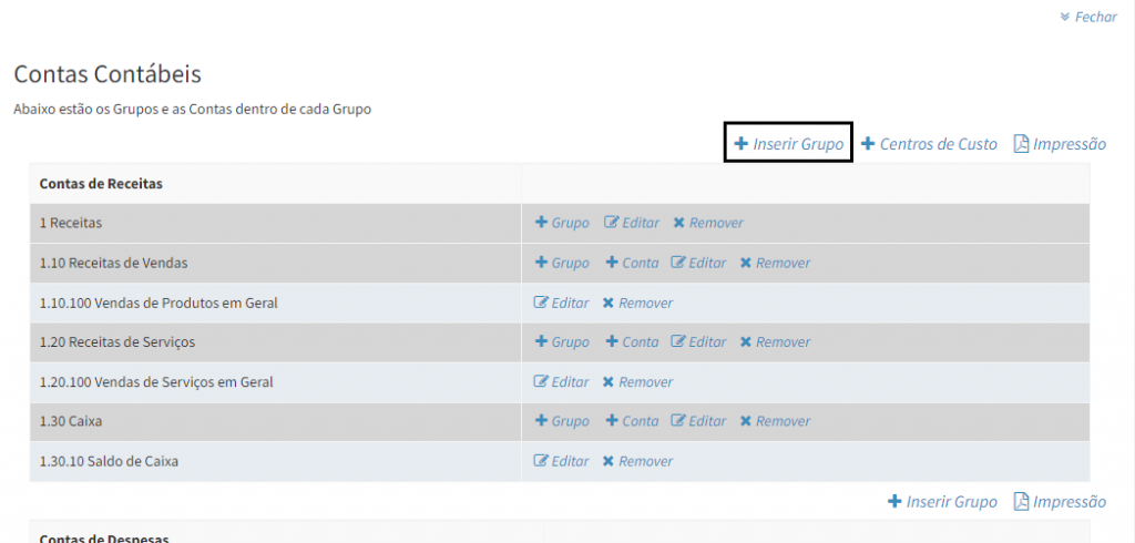 3. O sistema possui uma série de planos de contas cadastrados. Mas caso queira cadastrar um novo grupo, clique na opção Inserir Grupo.