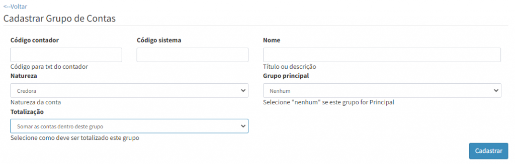 4. Na tela de Cadastro de Grupo de contas, insira as informações: