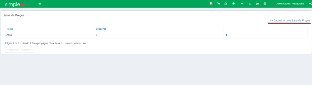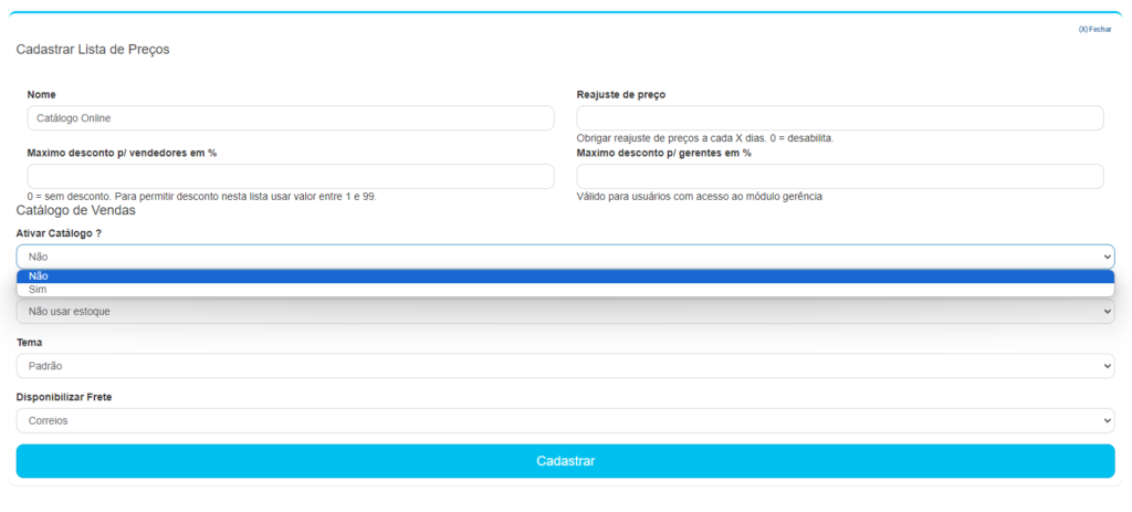 - Clique em “Cadastrar nova Lista de Preços” para criar uma lista específica ao catálogo online (opcional);