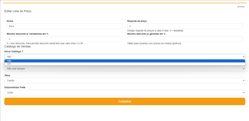 - Caso queira utilizar uma lista de preços já existente, clique no ícone “+”, e selecione a opção “Editar”, e no campo “Ativar Catálogo?” escolha “SIM”.
