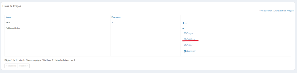 - De volta em “Cadastros” > “Listas de Preços”, clique no sinal de “+”, então clique em “Catálogo” para acessar seu catálogo on-line.
