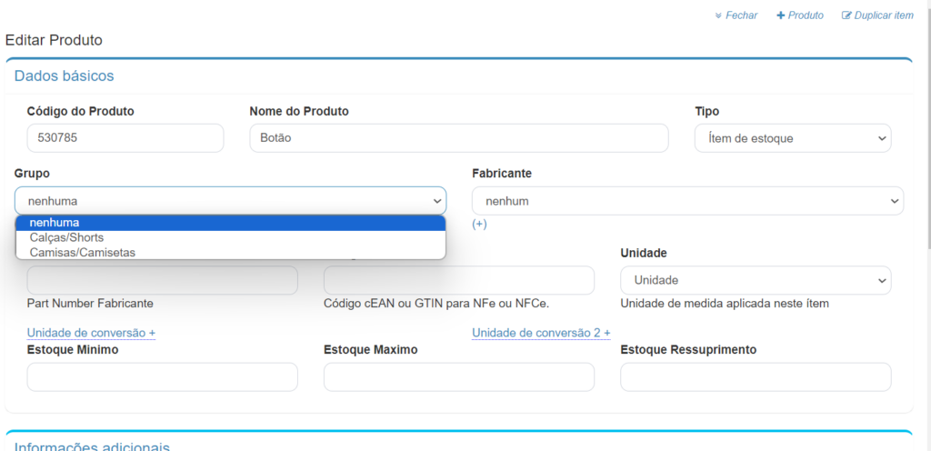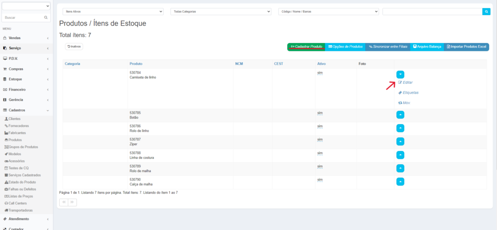 - Em “Cadastro” > “Produtos”, certifique-se que cada produto está dentro de um grupo. Você pode fazer isso no cadastro inicial do produto, ou no botão azul, então em “editar”.