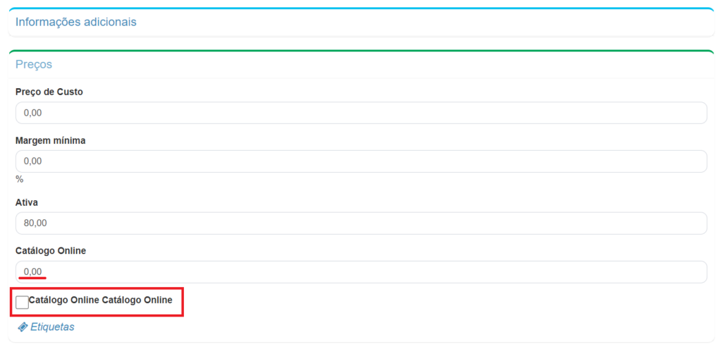 - Obs.: caso a caixa de seleção não apareça abaixo do preço do catálogo online, cadastre o grupo do produto, salve as alterações e feche a aba de cadastro/edição, então clique novamente no “Editar” de tal produto e vá em preços. A caixa de seleção irá aparecer.
