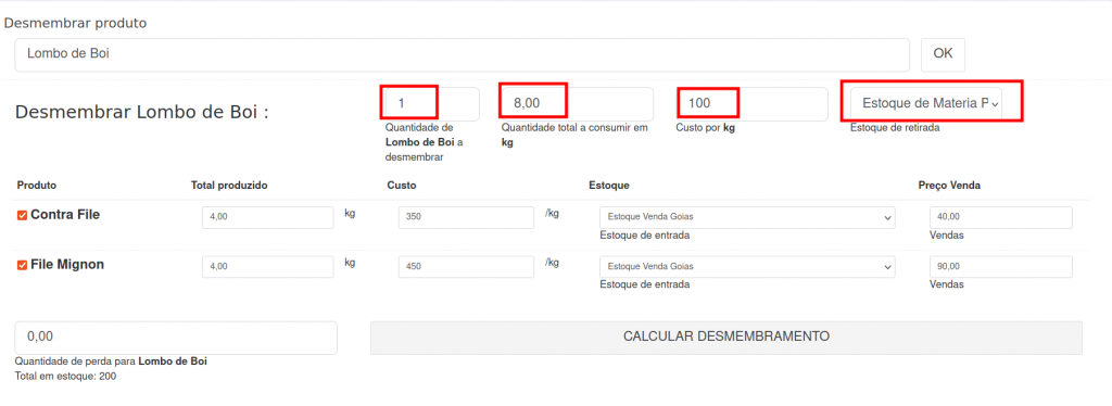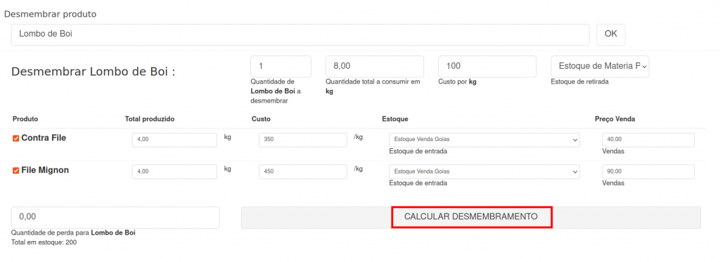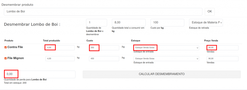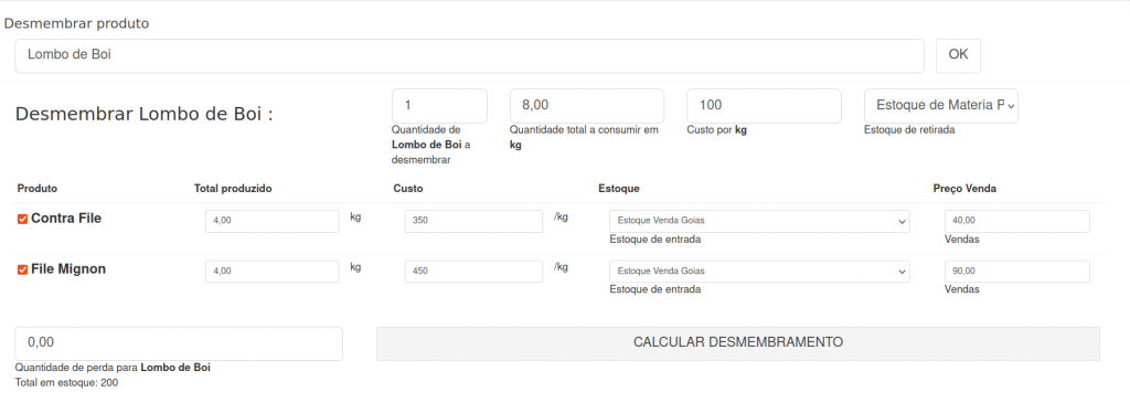 Você também pode informar a quantidade de perda que teve com o produto desmembrado;