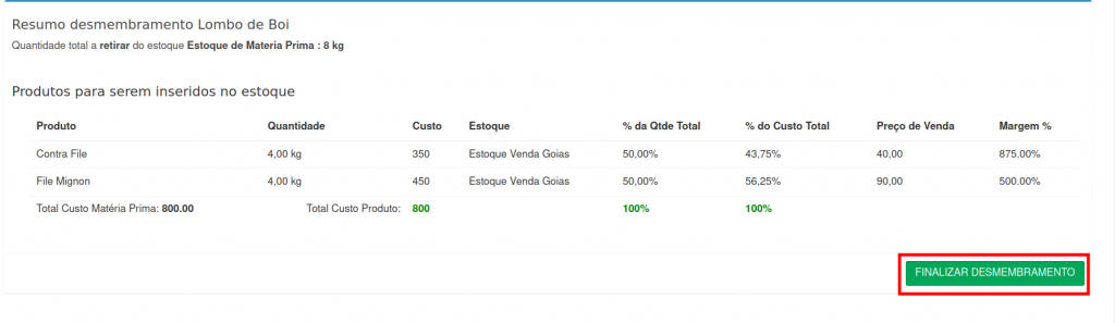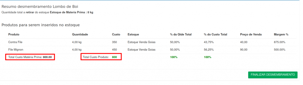 Observação: O valor total de custo do produto desmembrado tem que ser aproximado ao valor total de custo dos produtos.