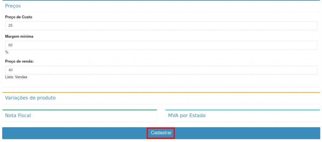 Retorne a tela cadastro de produtos e clique em Cadastrar Produto, e realize o cadastro conforme realizado anteriormente.