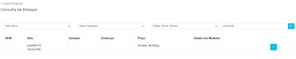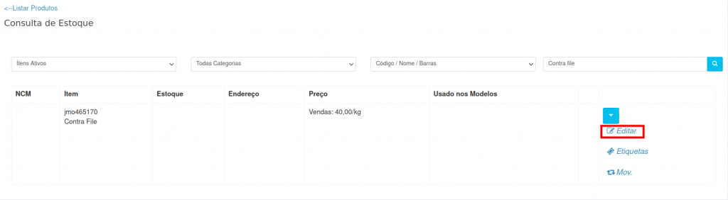 Na tela Produtos/ Itens de Estoque, busque o produto que decompõe o desmembramento