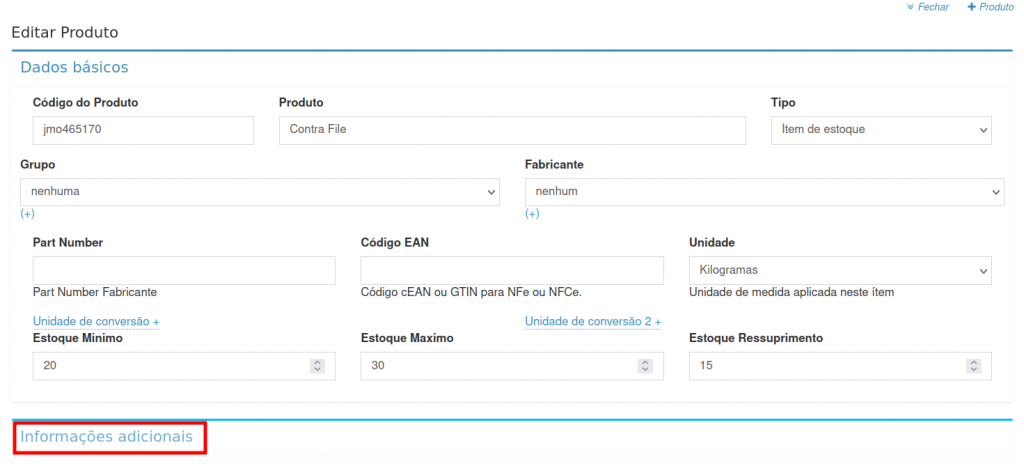 9. Na tela de Editar o produto, clique em Informações adicionais.