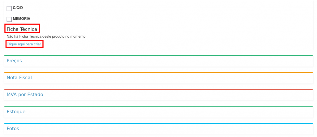 10. Em seguida role a barra de rolagem até a opção Ficha Técnica, depois clique em criar ficha técnica.