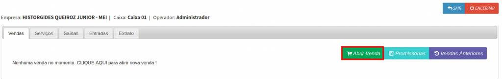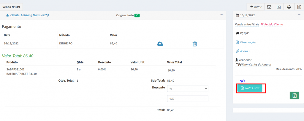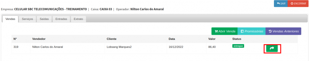 - Para emitir nota fiscal, localize a venda realizada na tela de vendas em seguida clique no botão verde.