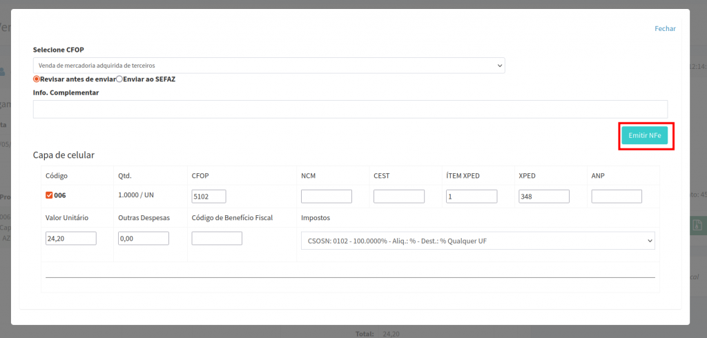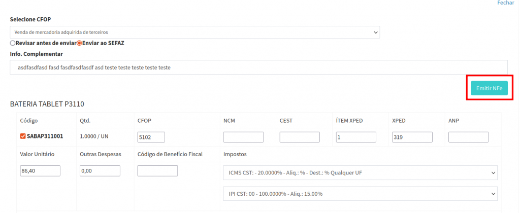 6. Ao selecionar a outra opção de Revisar antes de enviar e clicar em Emitir Nota fiscal.