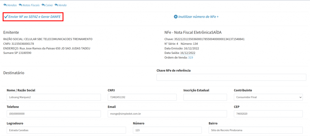 7. Você será direcionado para tela de revisar os dados da nota fiscal, após preencher e conferir os dados clique em Enviar NF ao Sefaz e Gerar Danfe para enviar a nota fiscal para o órgão responsável.