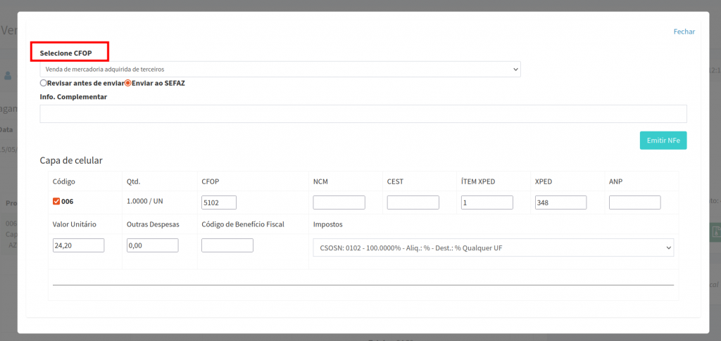 4. Caso tenha somente 1 modelo de emissão de nota fiscal, será necessário somente selecionar o CFOP.