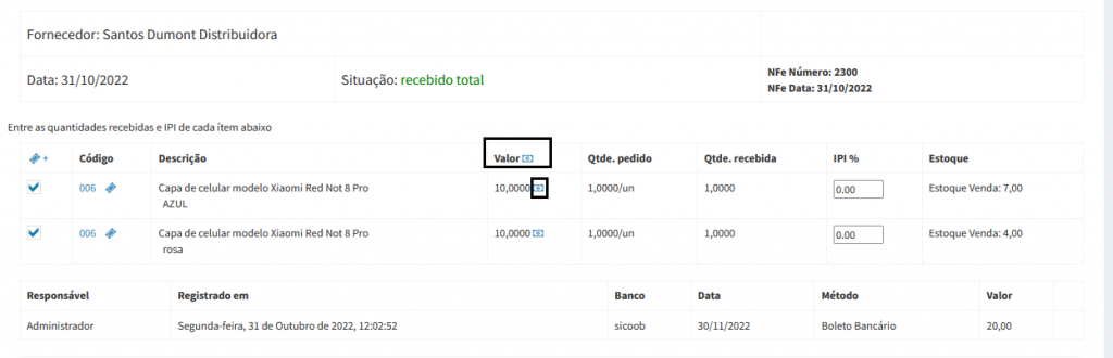 Após Registrar o recebimento em estoque o sistema exibe a opção para alterar o valor de venda do produto, na coluna valor clicando no ícone de cédula.