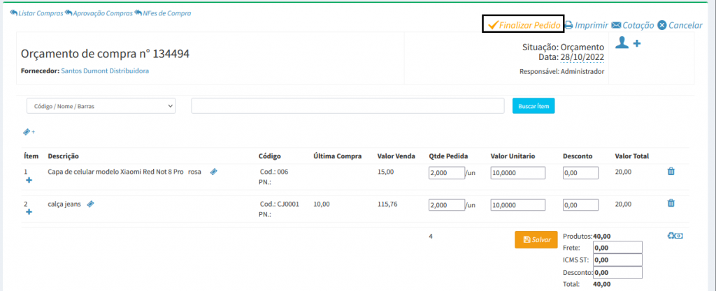 7. Após inserir os produtos no pedido de compra, clique em Finalizar Pedido.