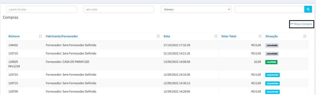 2. Na tela de compra, clique em Nova compra para realizar uma nova.