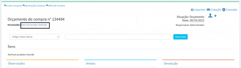 Em fornecedor, clique em Sem fornecedor definido, para buscar o fornecedor no sistema. Caso o fornecedor não esteja cadastrado em sistema será necessário cadastrar, segue o link como cadastrar o fornecedor Como cadastrar Fornecedor.