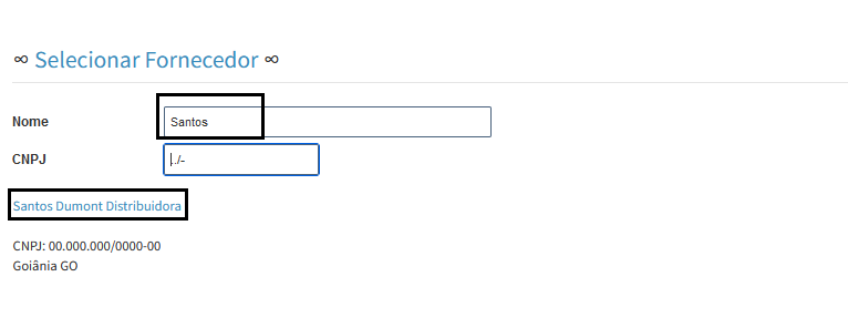 4. Na tela de selecionar fornecedor, pode ser selecionado pelo Nome ou CNPJ.