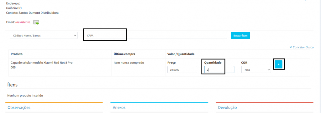 5. Após selecionar o fornecedor, você precisa selecionar os produtos e a quantidade que foi comprado.
