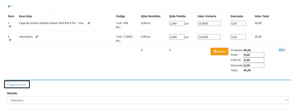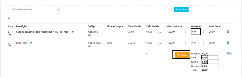 6. É possível informar se o produto teve algum desconto, valor do frete e ICMS, caso tenha alguma dessas informações após inserir clique no botão Salvar.