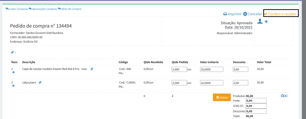 10. Você será direcionado para tela de conferir os produtos e dar entrada em estoque, onde é possível fazer algumas alterações.