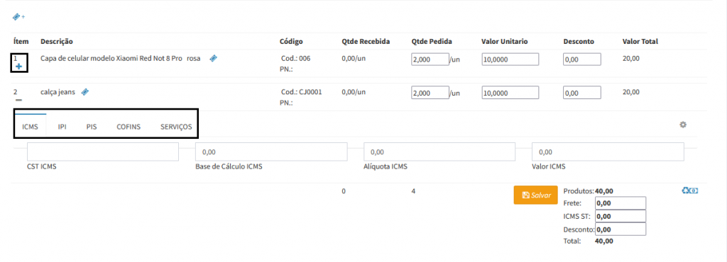 9. Clicando no ícone com sinal de + de cada produto você tem a opção de informar o imposto deste produto.
