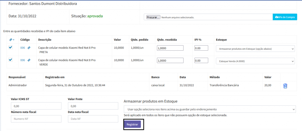 Após conferir os produtos, clique em Registrar.