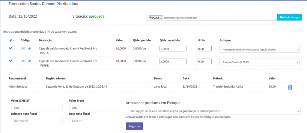 É possível anexar a nota fiscal de comprar, clicando em NFE de Compra;