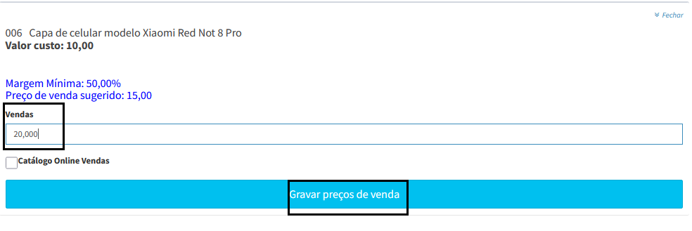 Após alterar o valor, clique em Gravar preços de venda.