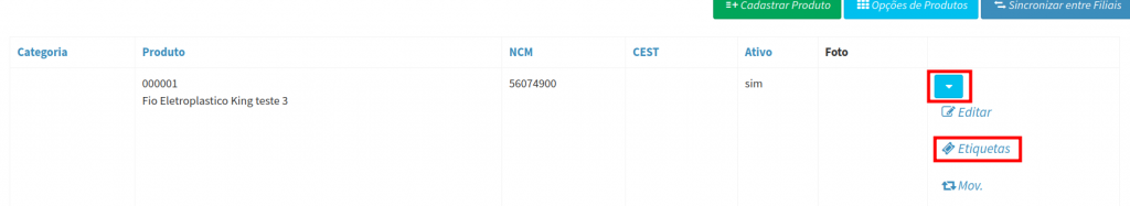 2. Na tela Listar Produtos, busque o produto que deseja gerar a etiqueta depois clique em Etiquetas.