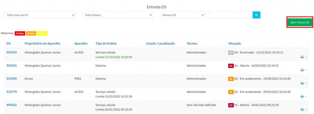 2. Na tela Listar ordens de serviços, são exibido todas as O.S geradas. Para adicionar uma nova ordem de serviço, clique no botão Abrir Nova O.S.